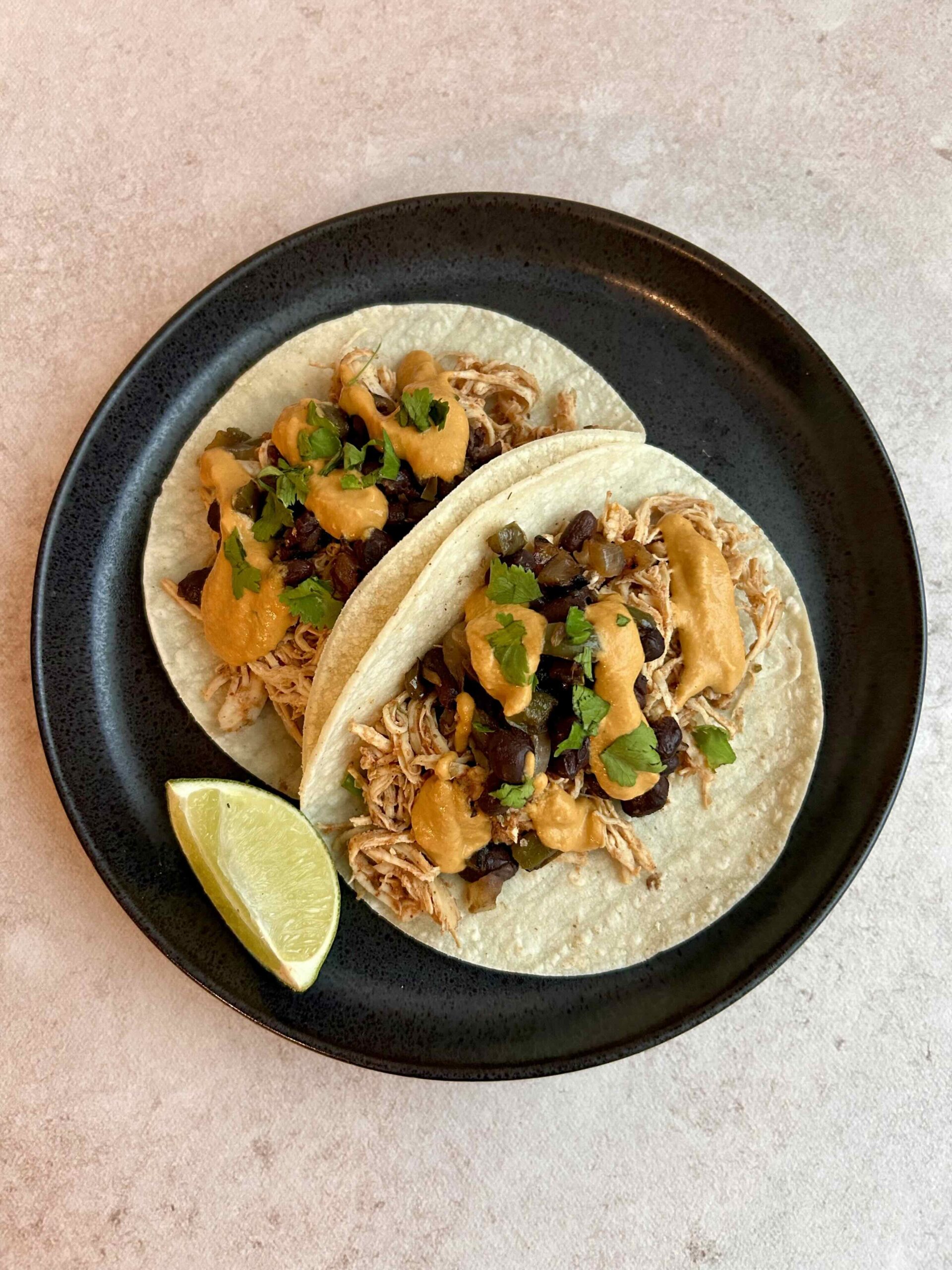 Shredded Chicken Tacos with Roasted Red Pepper Crema