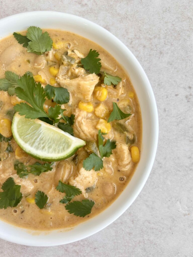This creamy white chicken chili is a cozy meal that feels comforting and filling, but still leaves you feeling good afterward. Smoky poblano peppers, sweet corn, tender chicken breast, and hearty pinto beans simmer together in a warmly spiced broth, then get mixed with silky cashew cream for richness without the heaviness. The result is a creamy, delicious chili layered with savory and subtly smoky flavors.